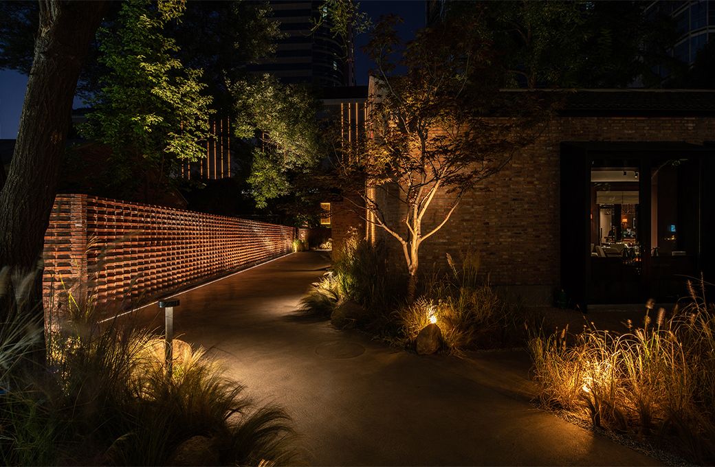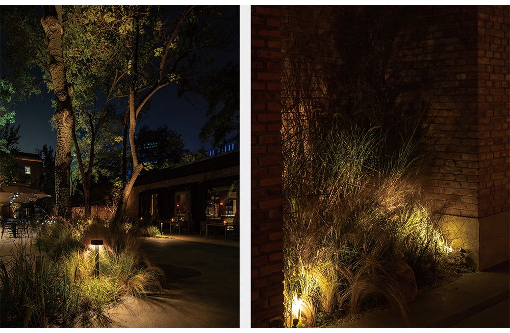 院内的园林造景,因环境及效果需求分别选用迷你投射灯KA-A101、插泥式投光灯OFA-107P、壁挂式投光灯OFA-107C、埋地灯OGA-208RA;通道旁的绿植中安装草坪灯GA-206A,微微透光加上树影摇曳,置身其中颇有岁月静好之感。