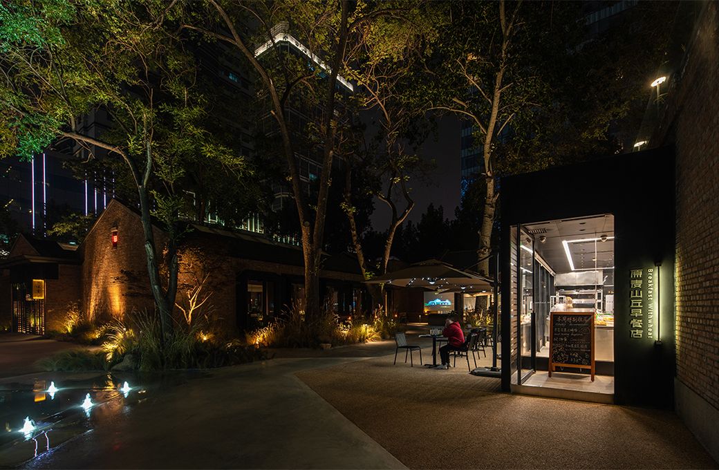 The store creates a lighting environment according to its own style, highlighting the mood with soft lighting, while the position of the lamps and doors and windows to maintain a sufficient distance, weakening the impact of indoor light on the outdoors. With red bricks, ancient trees and a small courtyard terrace, this courtyard loaded with city memories exudes a calm and quiet charm in light and shadow, becoming a chic courtyard space hidden in the downtown area.