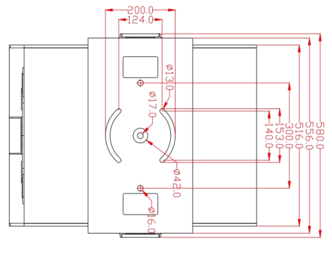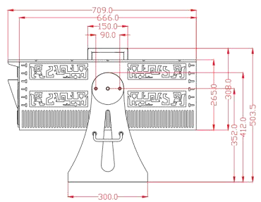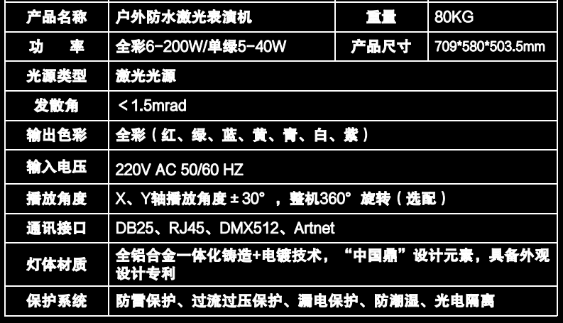 可编辑任意根光束、光幕及任意形状的光束或光幕排列; 光束、光幕、时空隧道、北极光表现形式多样,应用范围更广; 专利360°旋转云台:专业云台系统,可承重100kg,实现X、Y轴播放角度±30°,整机360°旋转,适用范围更广。 产品尺寸: