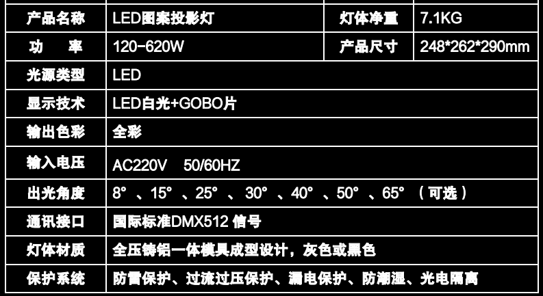LED光源亮度高、显色纯正,可实现各类图案的静态投影。